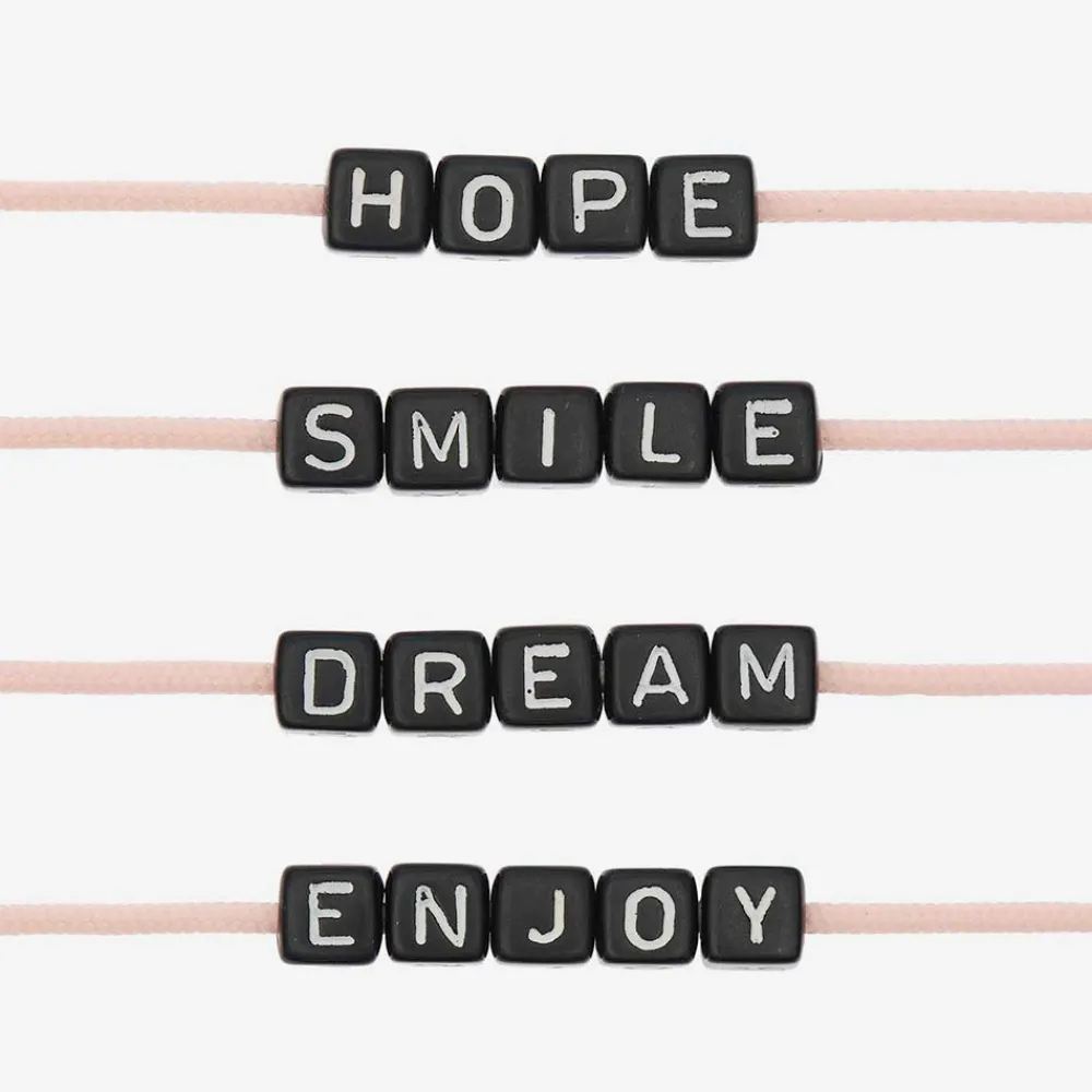With Those Pearls Square Black Decorated With White Letters, Create 4 Bracelets Yourself Before Offering Them. You Will Be Able To Form The Words: Hope, Smile, Dream And Enjoy.