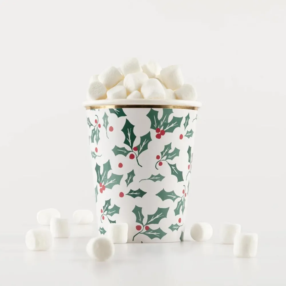 Are You Organizing A Christmas Eve Meal? These 8 Paper Cups Christmas Holly Prints With Gold Edging Will Be Perfect For Your Christmas Table.