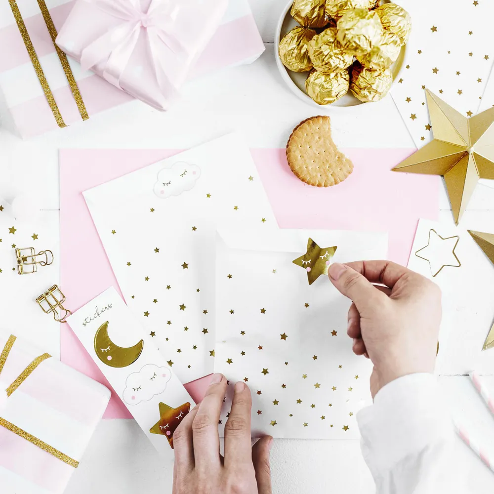 6 Paper Pockets Covered With Golden Stars To Be Closed With Moons And Stars Stickers. These Pouches Are Perfect For Giving The Traditional Guest Gift At The End Of The Tea Party (Treats, Balloon Or Small Gift), For Angling, For Wrapping Advent Surprises Or For Wrapping Christmas Presents.