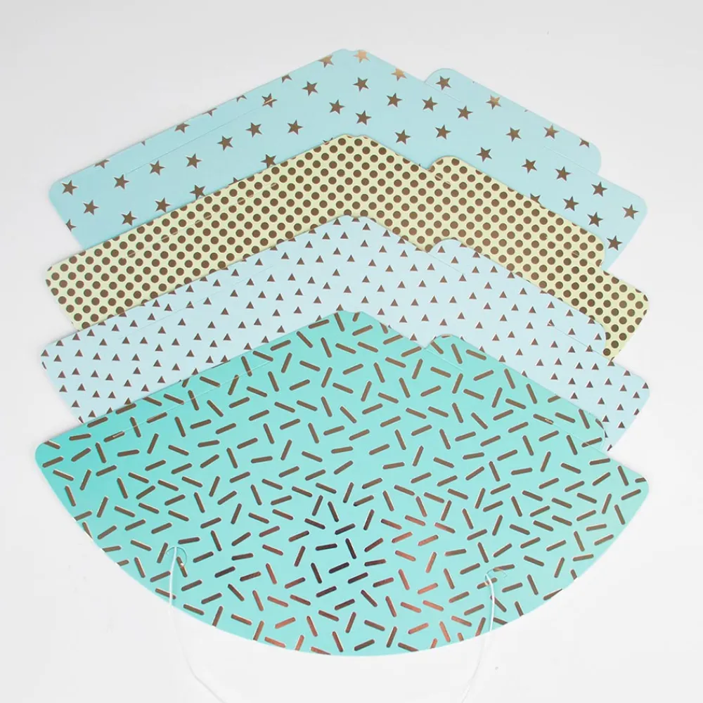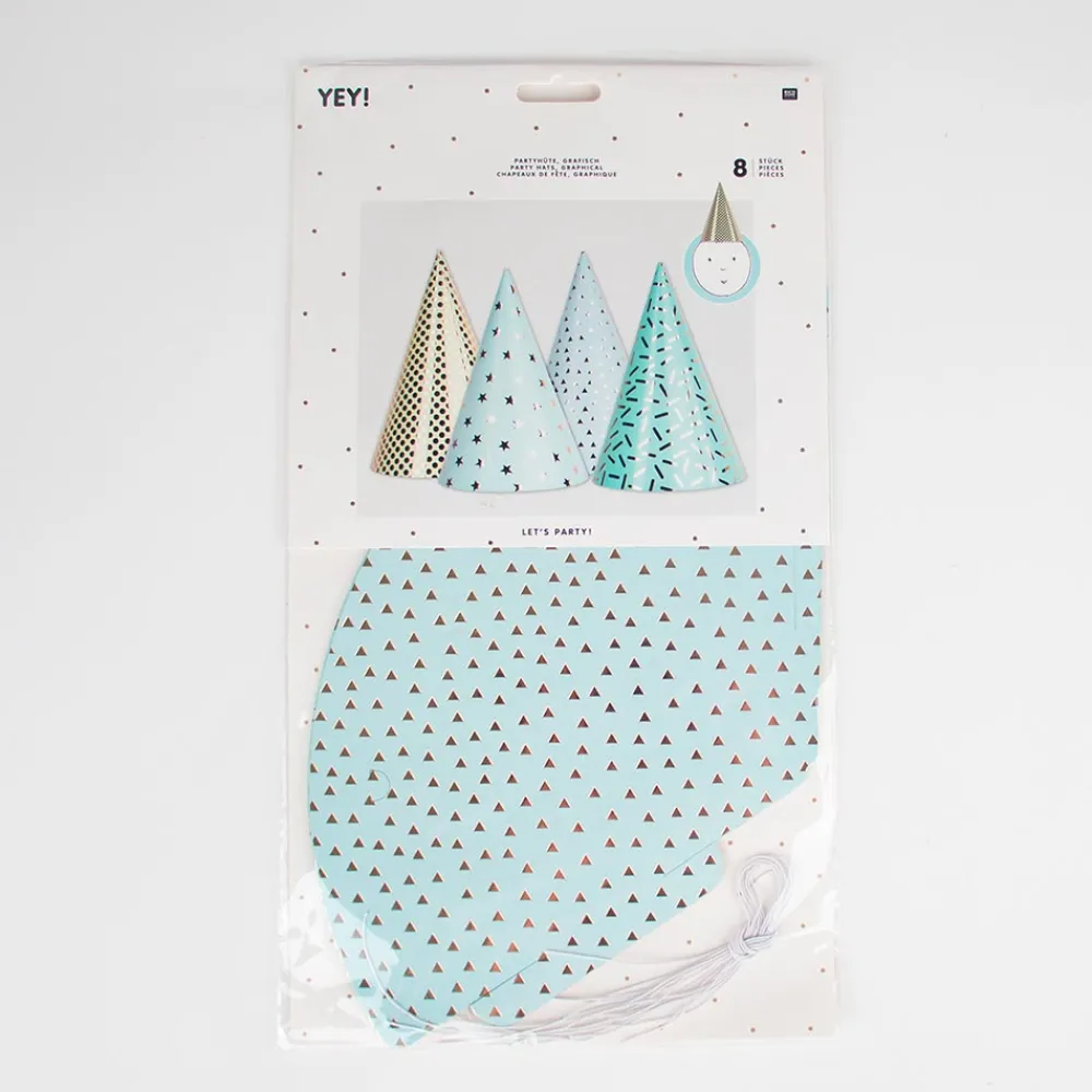 8 Pointed Hats In Blue Tones With Different Metallic Graphic Patterns.