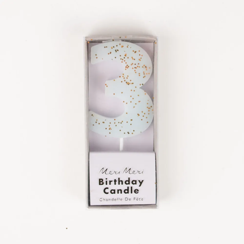 A Blue Number Candle With Glitter (3 Years) To Place On A Snow Queen Birthday Cake, Or On A Polar Animal Or Cloud Theme!