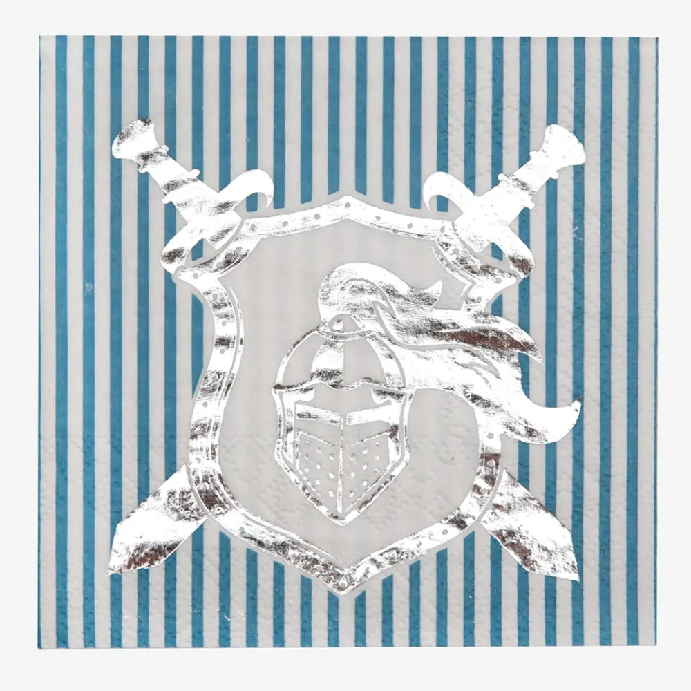 20 Paper Napkins Adorned With A Shield With A Knight’S Coat Of Arms And Blue Stripes For A Knight’S Birthday Party!