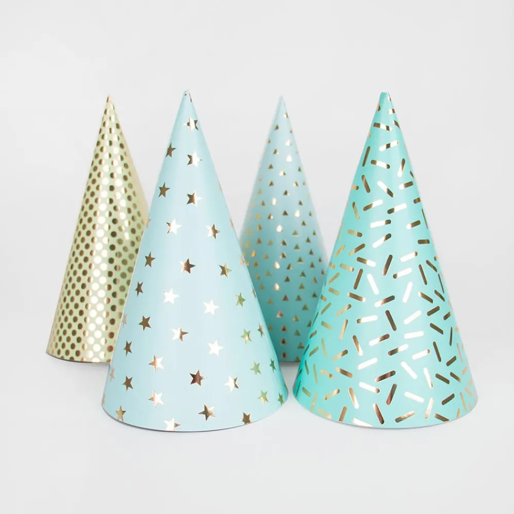 8 Pointed Hats In Blue Tones With Different Metallic Graphic Patterns.
